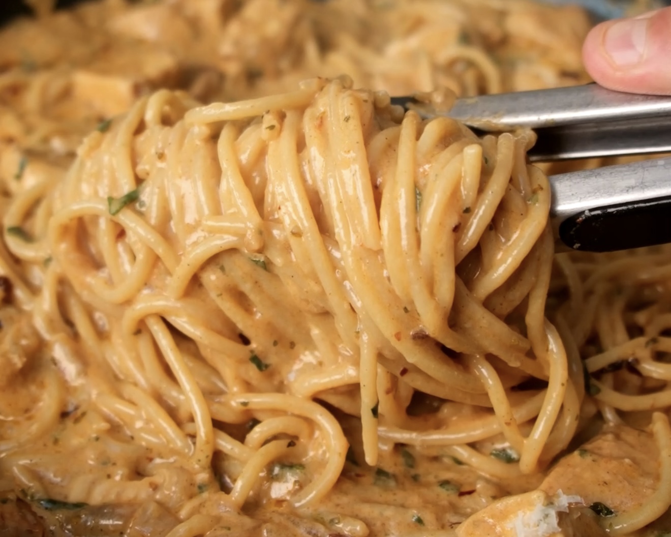 Delicious, jammy red onions, spicy seared peri peri chicken breast tossed together in a creamy Alfredo sauce with spaghetti. Part of my everything PASTA series.